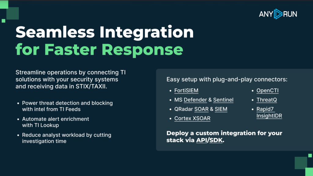 Whether through integrations or manual use, threat intelligence from ANY.RUN becomes a part of the SOC investigation cycle that supports early detection and smart decisions.