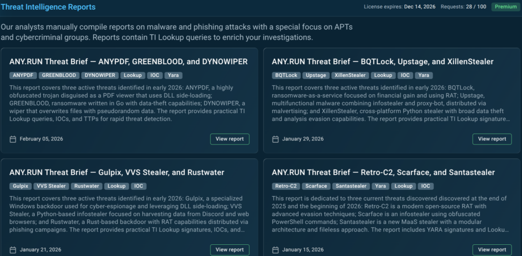ANY.RUN TI Reports address the partial visibility challenge in SOC teams by providing threat overviews curated by our experts, turning analyst-driven insights into strategic intelligence with threat behaviors, TTPs, and detection opportunities already described and contextualized.
