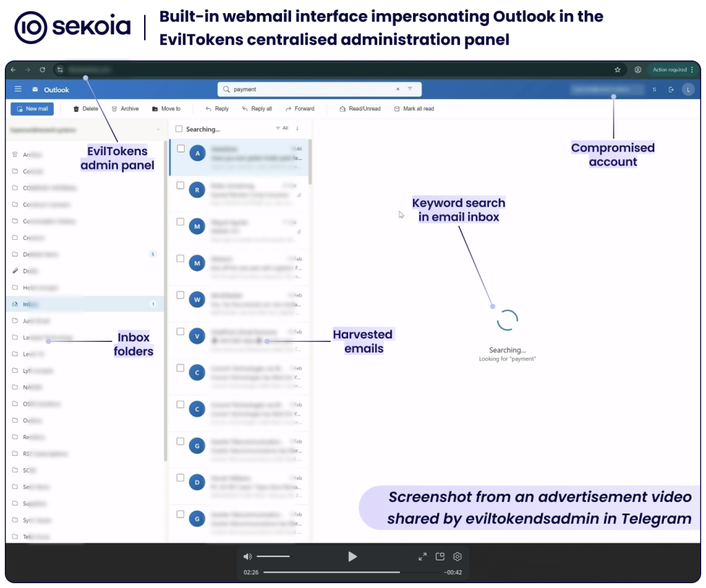 Sekoia TDR assess that Eviltokens is the first PhaaS to offer AI-augmented post-compromise tooling. The integration of LLM-driven automation significantly reduces the attacker’s processing time and lowers the entry barrier for threat actors. Traditionally, conducting BEC fraud required both technical and social engineering skills to manually review compromised mailboxes, identify financial opportunities, and craft convincing BEC attack scenarios. EvilTokens eliminates these steps and enables attackers to scale their fraudulent operations accordingly.