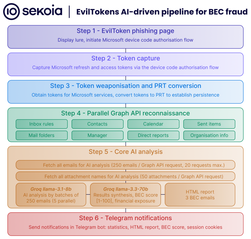 Below is an overview of the EvilTokens AI-driven pipeline for BEC fraud: