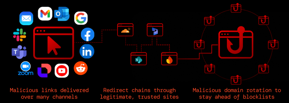 Modern attacks are designed to evade detection controls, with varied delivery channels, trusted sites abuse, and rapid domain rotation to stay ahead of known-bad detections.