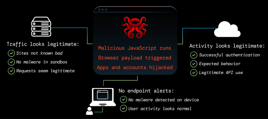 Attackers are following a familiar playbook: hijack apps via accounts, dump the data, and profit through data resale and extortion. Many traditional security tools are effectively bypassed by operating inside the browser sandbox, where EDR (Endpoint Detection and Response) agents see a browser process but not what’s happening within the session, and where web proxies see obfuscated traffic but not client-side page behavior.