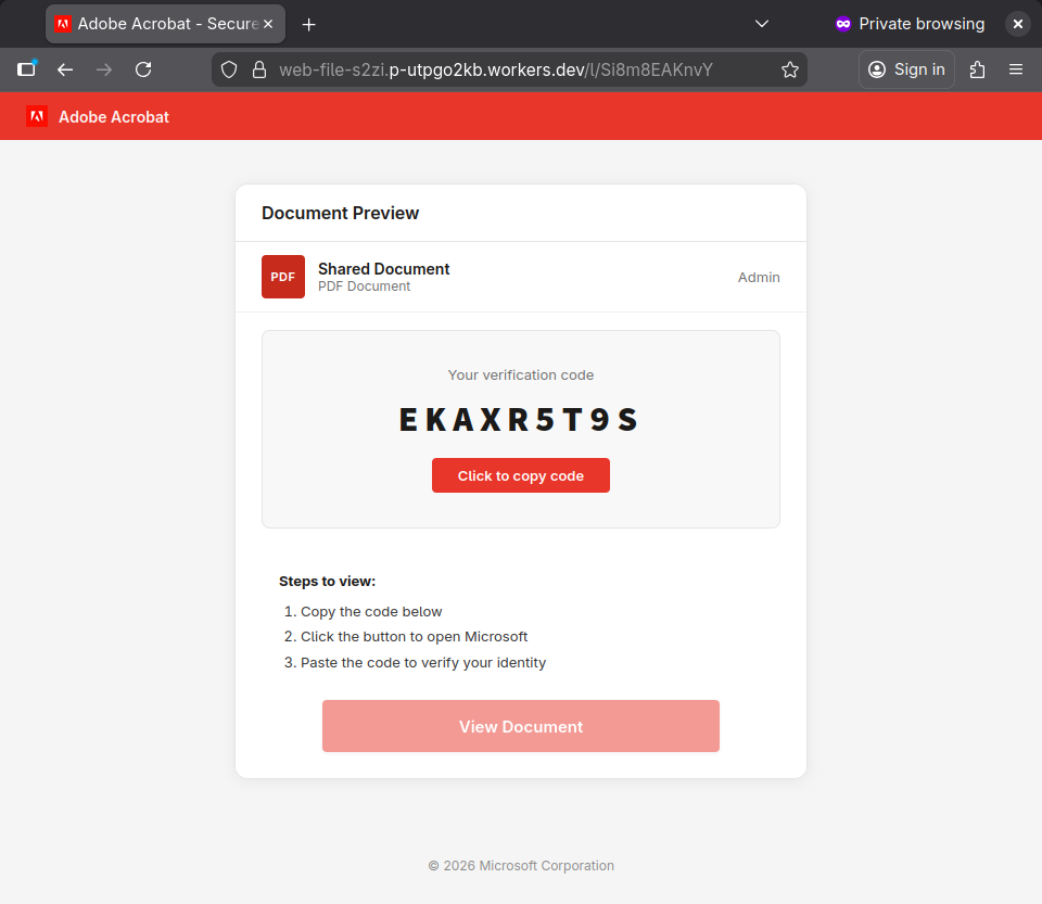 Una volta caricata la pagina web di phishing vera e propria, viene eseguito in background uno script JS che interagisce con l’endpoint di autenticazione Microsoft per generare dinamicamente un codice dispositivo. Il codice viene quindi visualizzato sullo schermo dell’utente insieme a un pulsante che lo reindirizza al portale ufficiale di autenticazione microsoft.com/devicelogin.