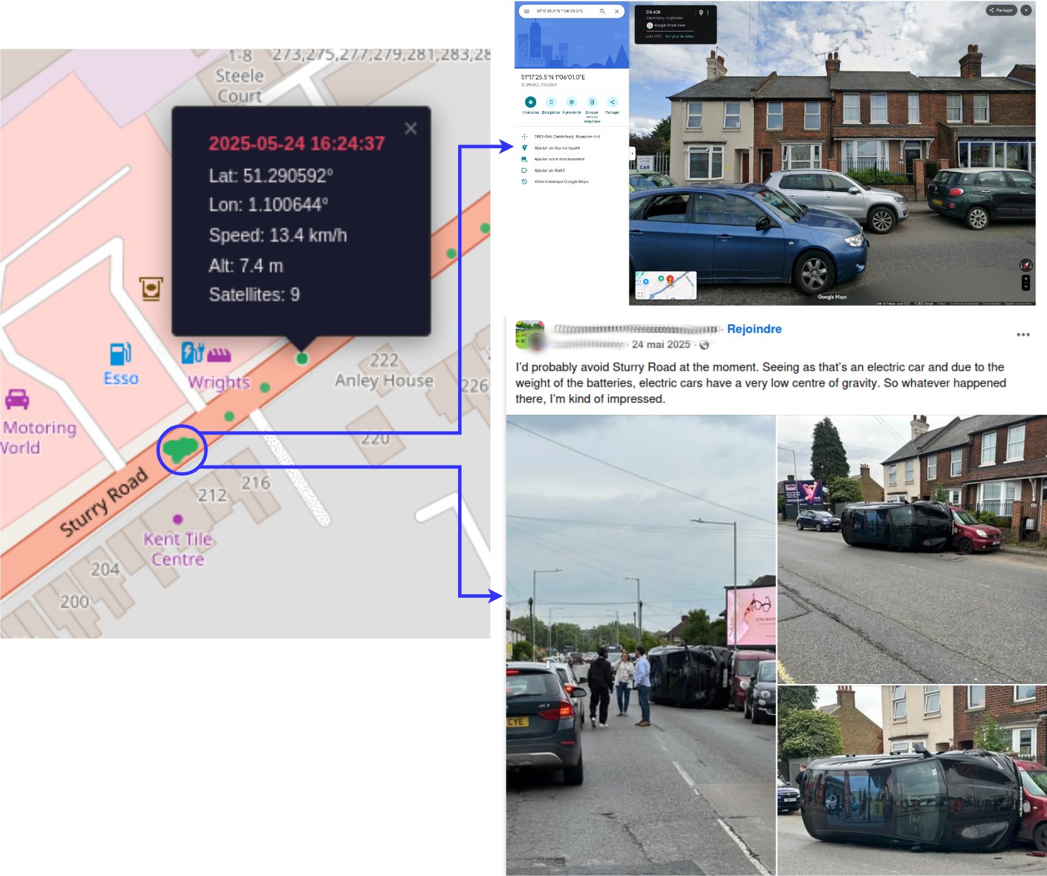 To investigate further, we performed a simple OSINT search using the location and date. This led us to a public Facebook post showing a car accident at the exact same location and date. The images and context perfectly matched the GNSS data, explaining why multiple GPS points were recorded at the same position.