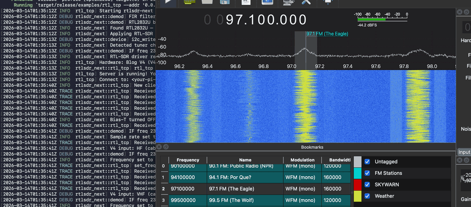 rtlsdr-next is a ground-up Rust rewrite. It exposes SDR data as a native Tokio Stream, ships a zero-allocation DSP pipeline, and has first-class support for the RTL-SDR Blog V4 — a newer hardware variant the upstream driver handles correctly but never cleanly abstracted. The result is faster, safer, and substantially easier to build applications on top of.