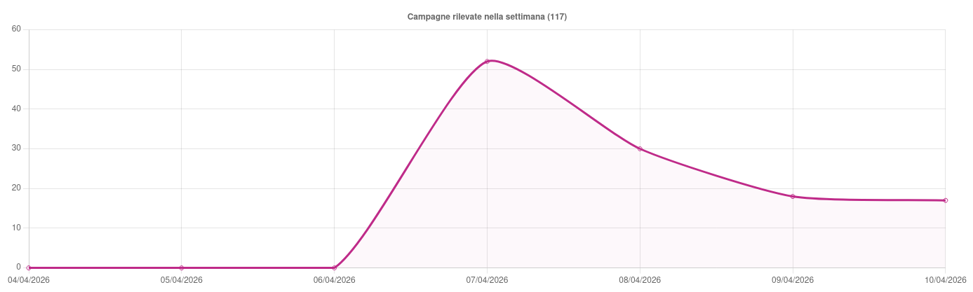 In questa settimana, il CERT-AGID ha riscontrato ed analizzato, nello scenario italiano di suo riferimento un totale di 117 campagne malevole, di cui 90 con obiettivi italiani e 27 generiche che hanno comunque interessato l’Italia, mettendo a disposizione dei suoi enti accreditati i relativi 2313 indicatori di compromissione (IoC) individuati.