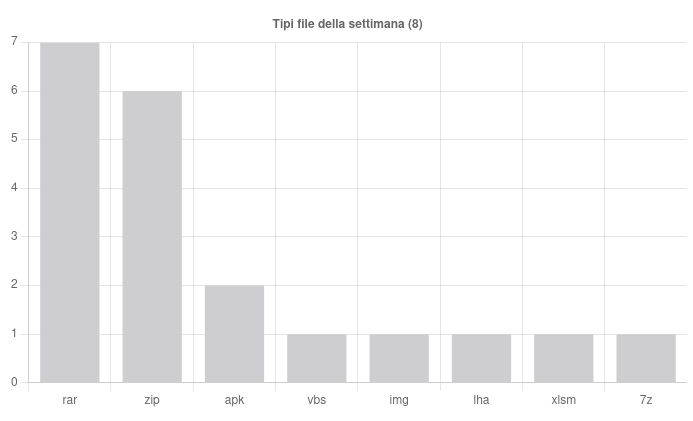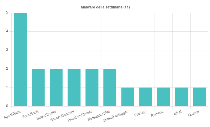 Sono state individuate, nell’arco della settimana, 11 famiglie di malware che hanno interessato l’Italia. Nello specifico, di particolare rilievo, troviamo le seguenti campagne: