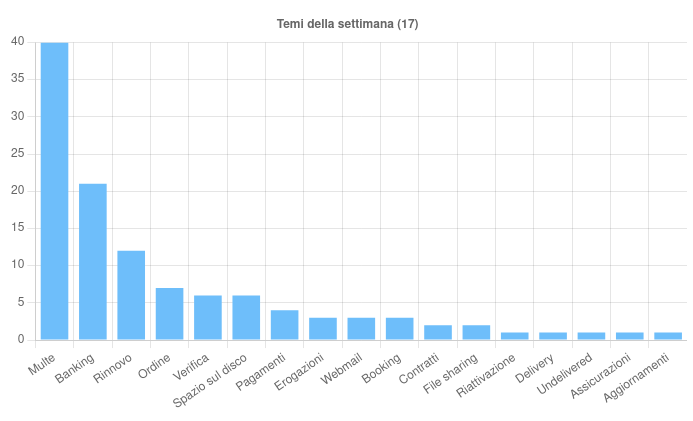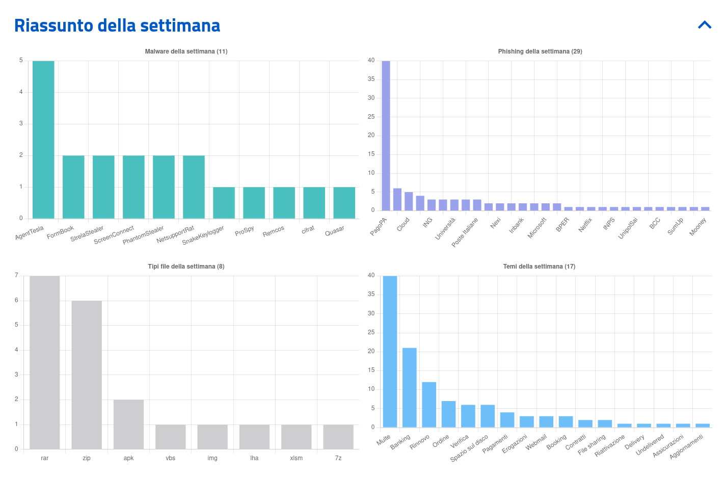 Sono 17 i temi sfruttati questa settimana per veicolare le campagne malevole sul territorio italiano. In particolare si rileva: