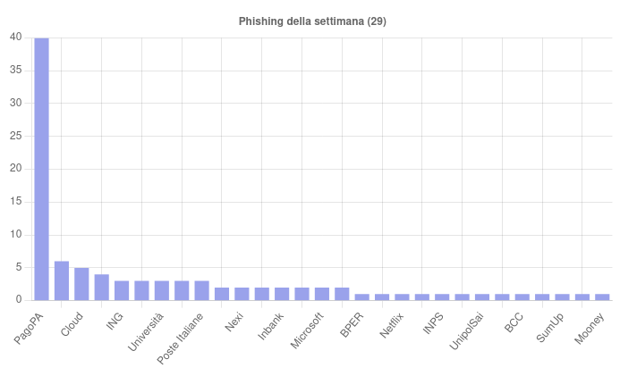 Sono 29 i brand della settimana coinvolti nelle campagne di phishing. Per quantità spiccano le campagne a tema PagoPA, Tessera Sanitaria e Klarna.