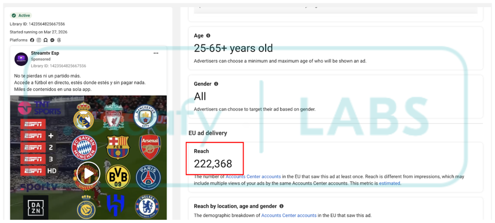 The delivery websites are promoted through Meta Ads (Facebook and Instagram). This distribution vector has become a common choice for Android banking trojans, enabling threat actors to reach a large audience quickly and with less effort. Furthermore, the choice of decoy, an illegal sports streaming application, reveals a clear understanding of the target demographic: since these apps are not available on the Google Play Store, users are already conditioned to sideload APKs from unknown sources, which makes social engineering much easier.