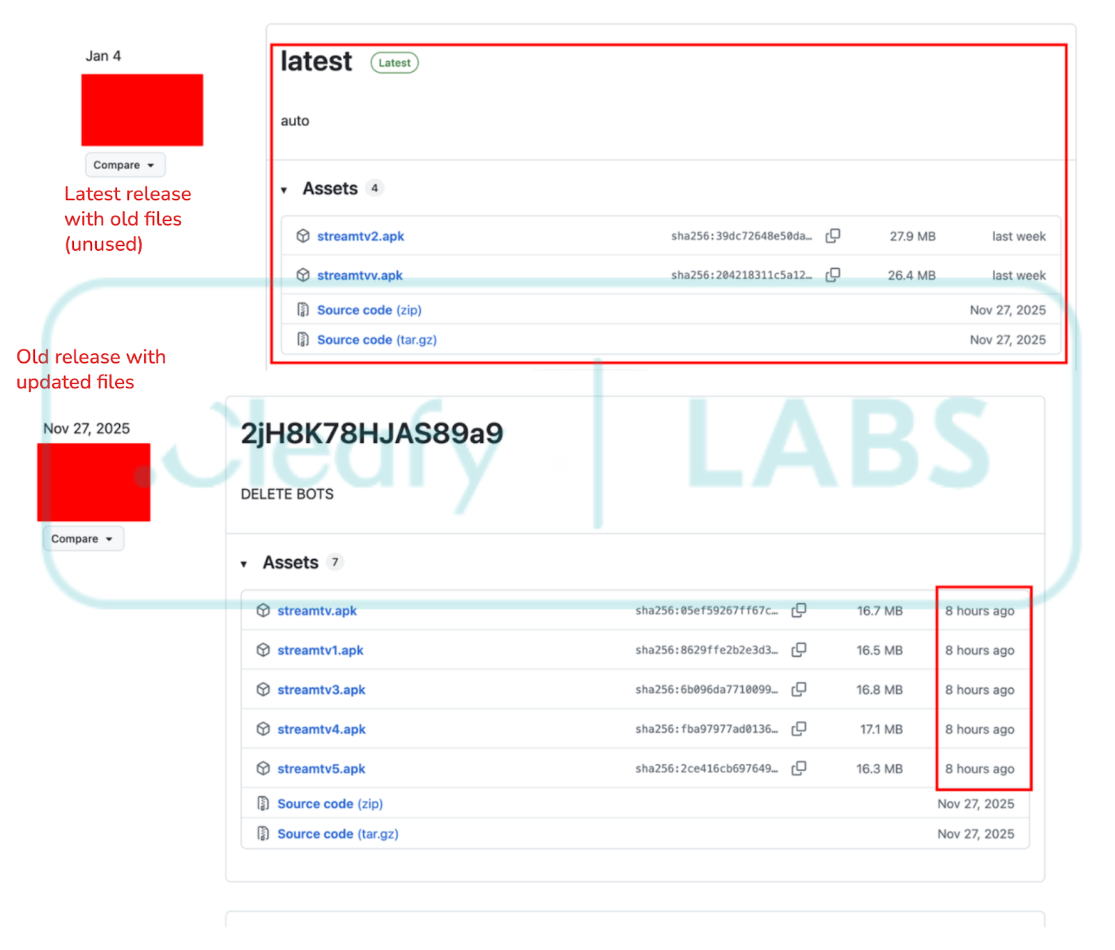 One interesting aspect of this delivery campaign is the abuse of GitHub for hosting the dropper applications. The affiliates leverage the Releases page to distribute and update their applications. Notably, new updates are pushed to pre-existing releases rather than creating new ones, likely as an evasion technique to hinder automated crawlers from easily retrieving fresh samples. The analysis revealed that while the samples' hashes changed daily, the application content remained unchanged, suggesting automated repacking or signature rotation to evade hash-based detection. Over the observed period, the Releases page contained multiple applications, starting with five and growing to over ten as the campaign matured.
