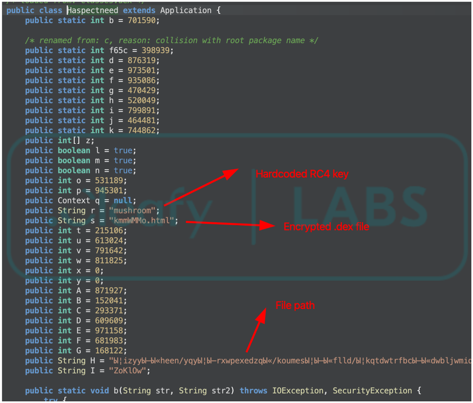 The dropper Android Package (APK) does not contain the malicious code in the code section. Instead, it holds an encrypted Dalvik Executable (.dex) file. The payload is hidden inside a file with a valid asset extension, loaded, and decrypted using RC4 and a hardcoded key.