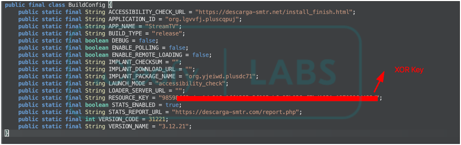 After successful decryption, the malicious .dex file contains the complete set of instructions to extract and install the final .apk file, contained in the res/raw/ folder. This file is encrypted using XOR with a hardcoded key in BuildConfig; the dropper decrypts the payload and proceeds with the installation. The malware developers claim that the final APK (the implant) may also be delivered from a remote server. This is also confirmed by the application's code: the configuration file contains a variable called IMPLANT_DOWNLOAD_URL that may contain this information. In the campaigns analyzed, this functionality was not active, and the implant was embedded inside the dropper application.