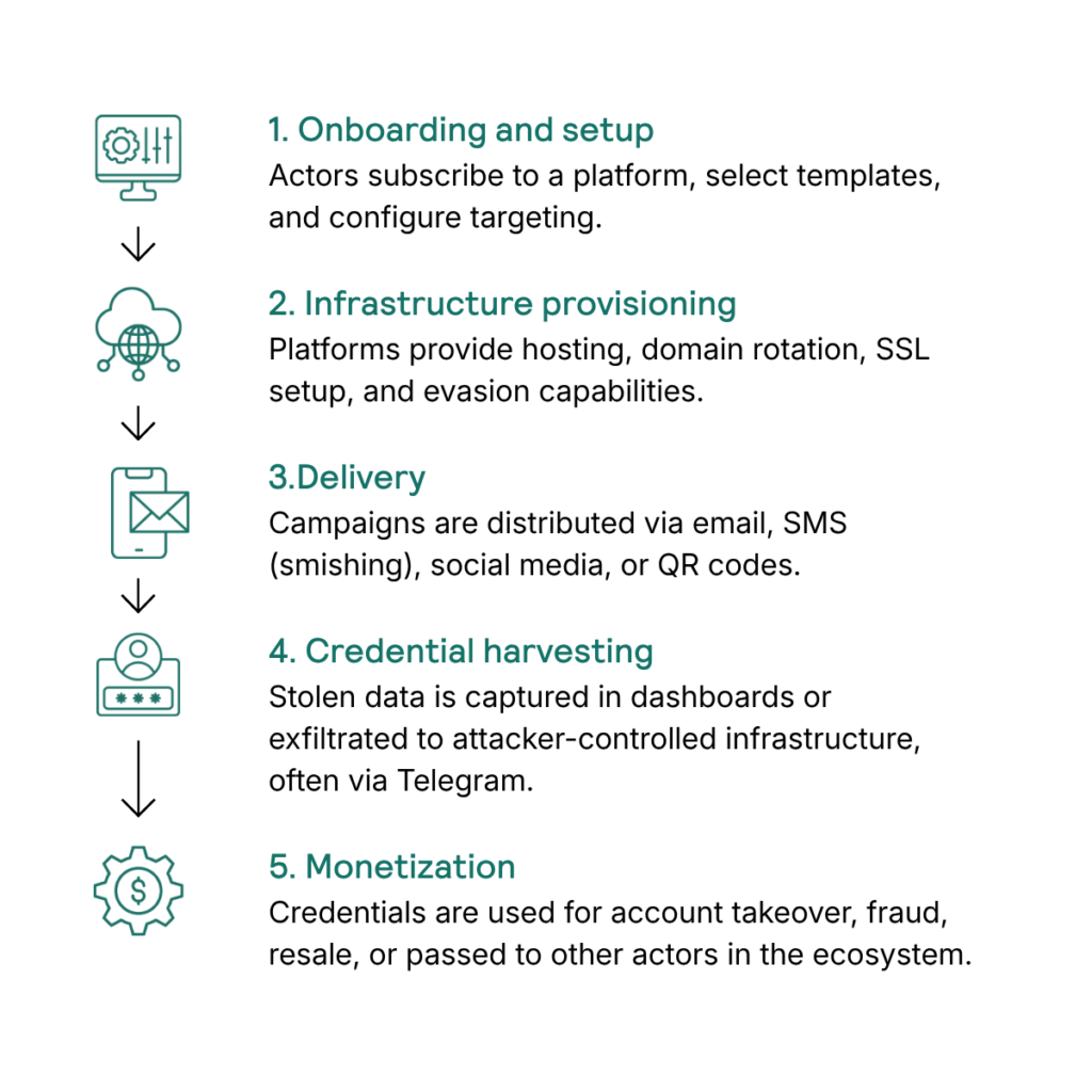 Early phishing activity relied on standalone kits — basic login pages and scripts that allowed attackers to collect credentials. Over time, operators began centralizing these capabilities into subscription-based platforms offering hosting, domain management, campaign tooling, and ongoing support.