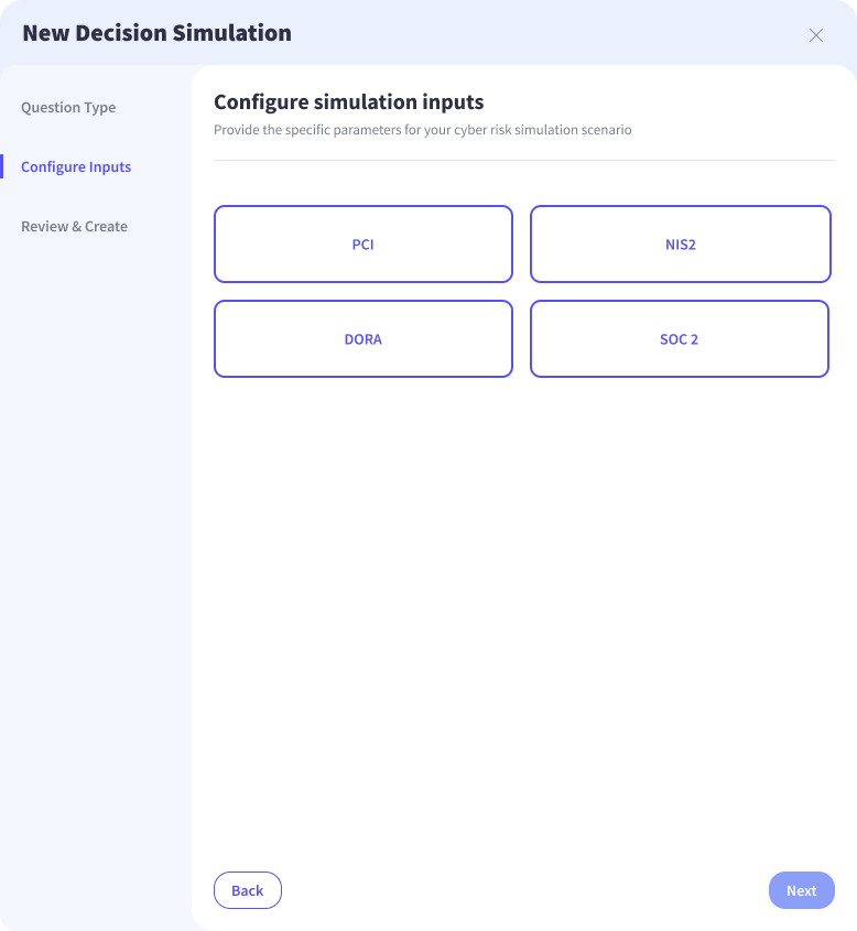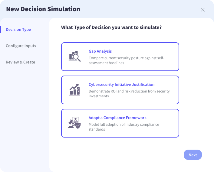 Clicking “Add Simulation” opens a three-step workflow that begins with the fundamental question of what type of decision needs to be evaluated. The answer determines how the simulation is configured and what inputs are required to model the outcome. The Decision Simulator currently supports three decision types, each reflecting a real strategic question that security and GRC leaders regularly face.