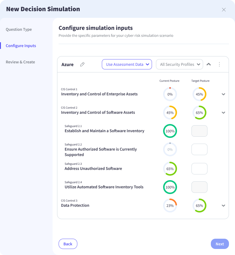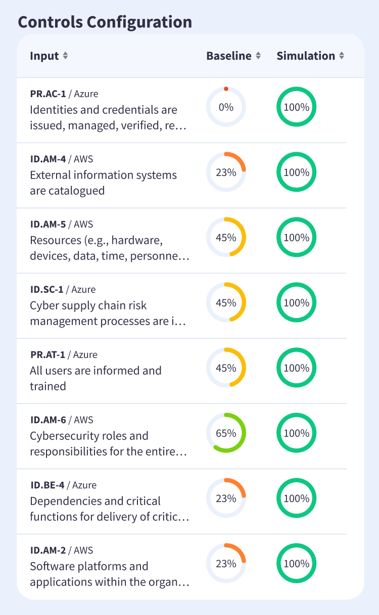 Targets can be drawn directly from prior control assessment results, keeping the simulation aligned with established GRC processes, or entered manually to model hypothetical improvements or exploratory scenarios. The screenshot above shows this configuration at the control and safeguard level, with current posture on the left and target posture on the right, giving users a precise, granular view of exactly what is being changed and by how much.