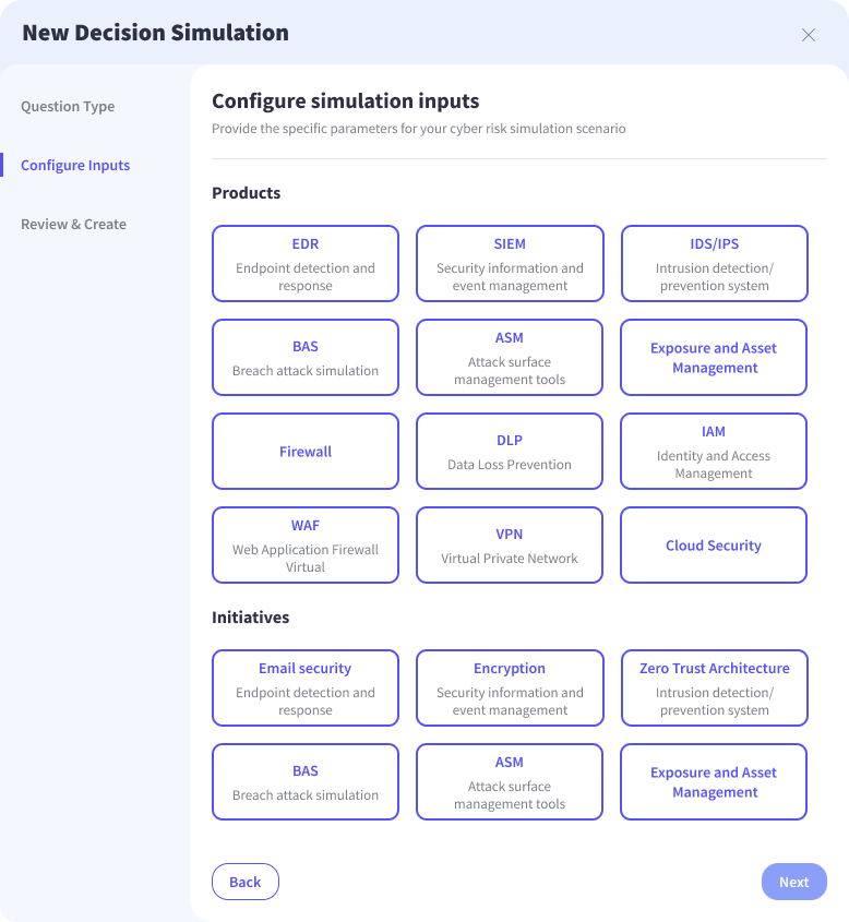 The Decision Simulator enables teams to model these investments directly through a set of standardized security capabilities and initiatives. Users define the type of capability being introduced, allowing each scenario to remain consistent and comparable within the broader risk model. Each selected capability is then systematically mapped to the controls it strengthens, creating a direct relationship between investment decisions and changes in security posture, ensuring that simulations reflect how improvements materialize at the control level.