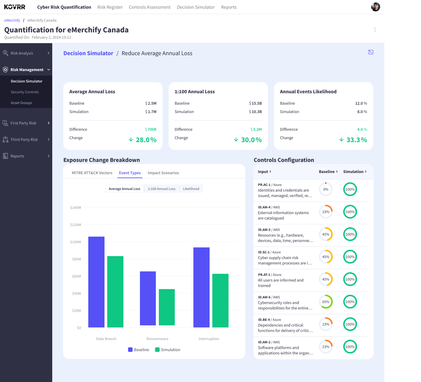 Simulations can be scoped to specific assets or business units, which matters considerably for organizations with multiple subsidiaries, regions, or operational environments. Control maturity rarely looks the same across an entire enterprise, and modeling improvements at that level of granularity produces results that are far more accurate and actionable than aggregated assumptions would allow. The final outputs connect those projected control improvements directly to financial impact.