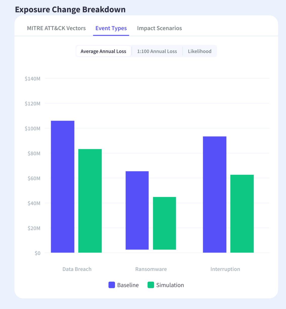 A detailed breakdown of exposure reveals how risk shifts across different dimensions. Loss is segmented by event types such as data breach, ransomware, and operational interruption, providing visibility into how specific scenarios are affected. Additional perspectives, including MITRE ATT&CK vectors and impact scenarios, extend the analysis by linking exposure changes to underlying threat patterns and business consequences. Greater granularity allows organizations to identify where risk is meaningfully reduced, as well as where it persists.