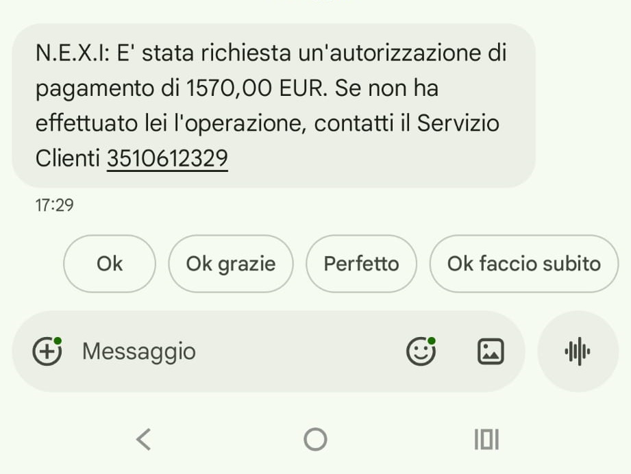 Il messaggio, che riportiamo di lato, segnala all'ignaro ricevente che è stato richiesto un pagamento di Euro 1570,00 sulla sua carta di credito collegata al circuito Nexi. Lo avvisa quindi che se non è stato lui ad autorizzare il pagamento , di chiamare il servizio clienti 3510612329