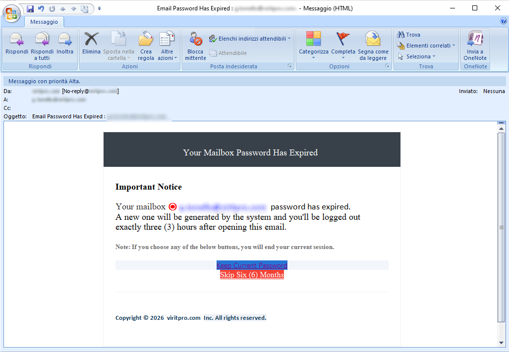 Analizziamo di seguito il tentativo di phishing che ha l'obiettivo di rubare le credenziali dell'account di Posta Elettronica del malcapitato. Il messaggio, in lingua inglese, informa il destinatario che la password del suo account di posta è scaduta e lo informa che è necessario aggiornarla il prima possibile, per continuare ad utilizzare i servizi collegati alla sua casella di posta. Per continuare ad usare la stessa password ha tempo 3 ore per confermare, attraverso il seguente link: