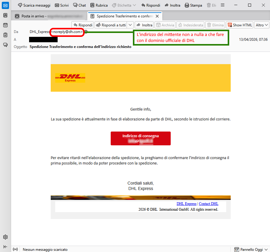 Di seguito un nuovo tentativo di phishing, che si cela dietro a una falsa comunicazione giunta apparentemente dal corriere DHL, relativamente alla consegna di un presunto pacco.