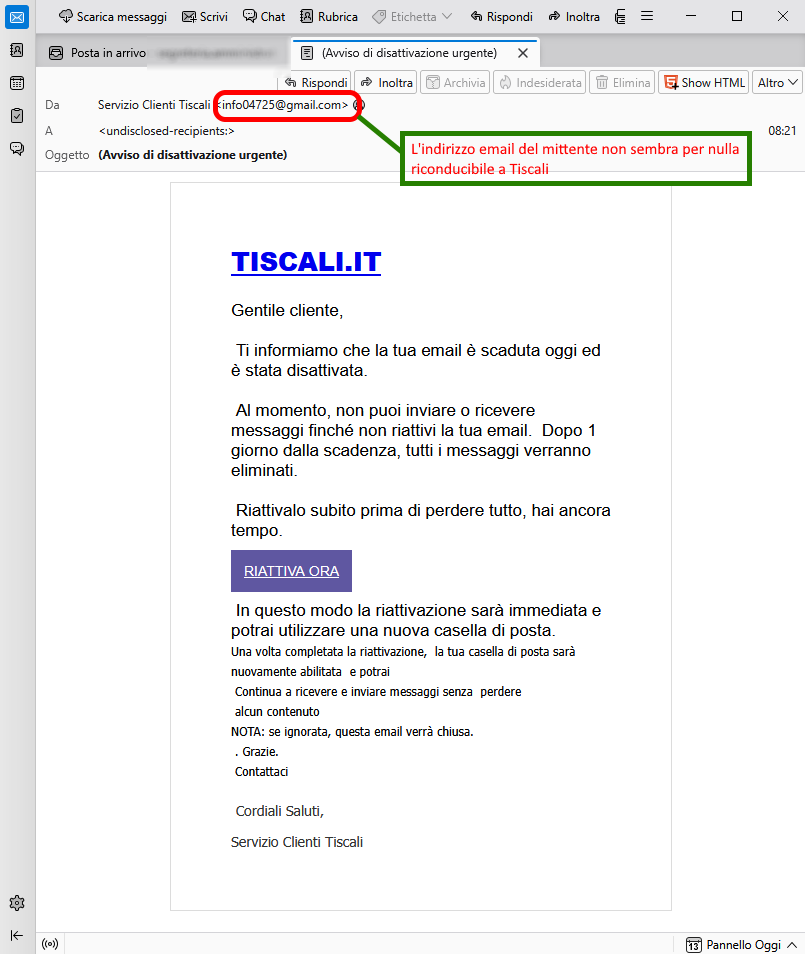 Analizzando attentamente il messaggio ci sono alcuni indizi che dovrebbero insospettire. Notiamo subito come l’indirizzo e-mail da cui proviene non è riconducibile al dominio ufficiale di TISCALI <info04725[at]gmail[dot]com> fatto questo decisamente anomalo. Un altro campanello d’allarme è che per effettuare la conferma venga richiesto di inserire le credenziali del proprio account tramite un link comunicato tramite e-mail.