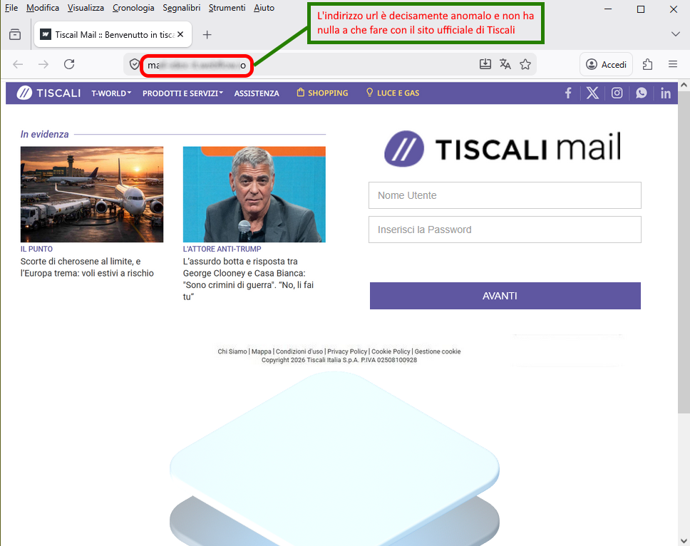 Notiamo che l'indirizzo url presente sulla barra del broswer è anomalo e non riconducibile al dominio ufficiale.