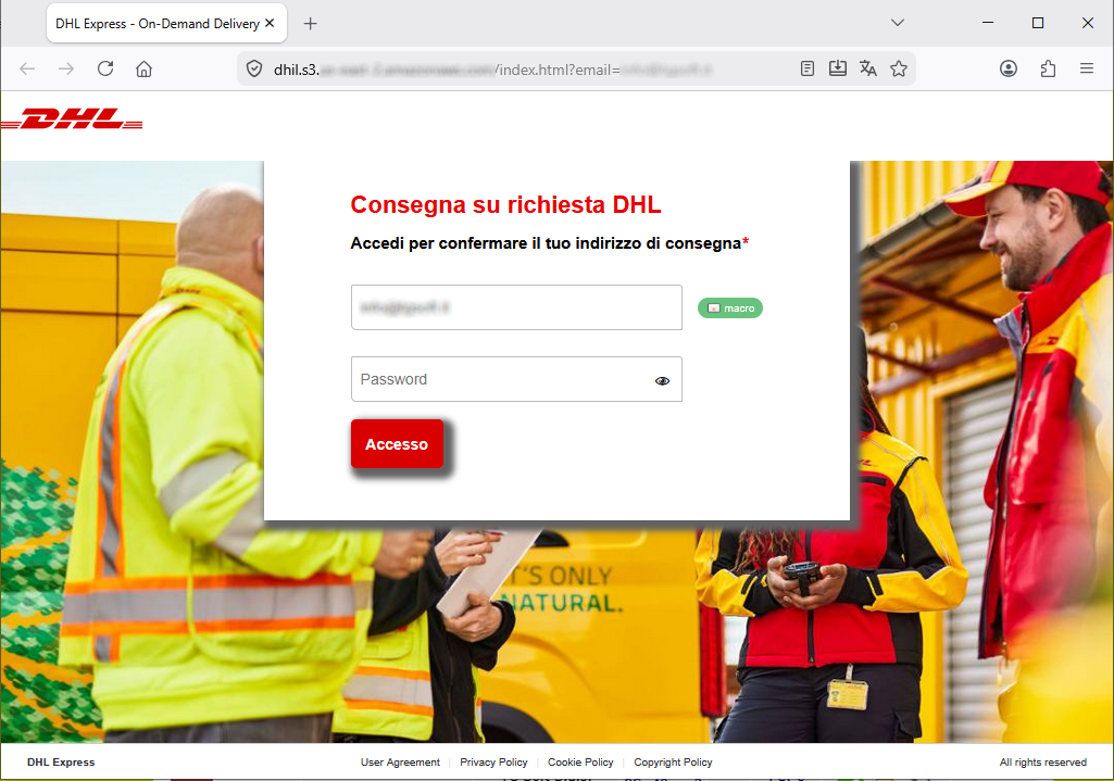 La pagina di "atterraggio", sebbene sia graficamente fuorviante, l'indirizzo url in cui è ospitata non ha nulla a che vedere con il dominio ufficiale di DHL.
