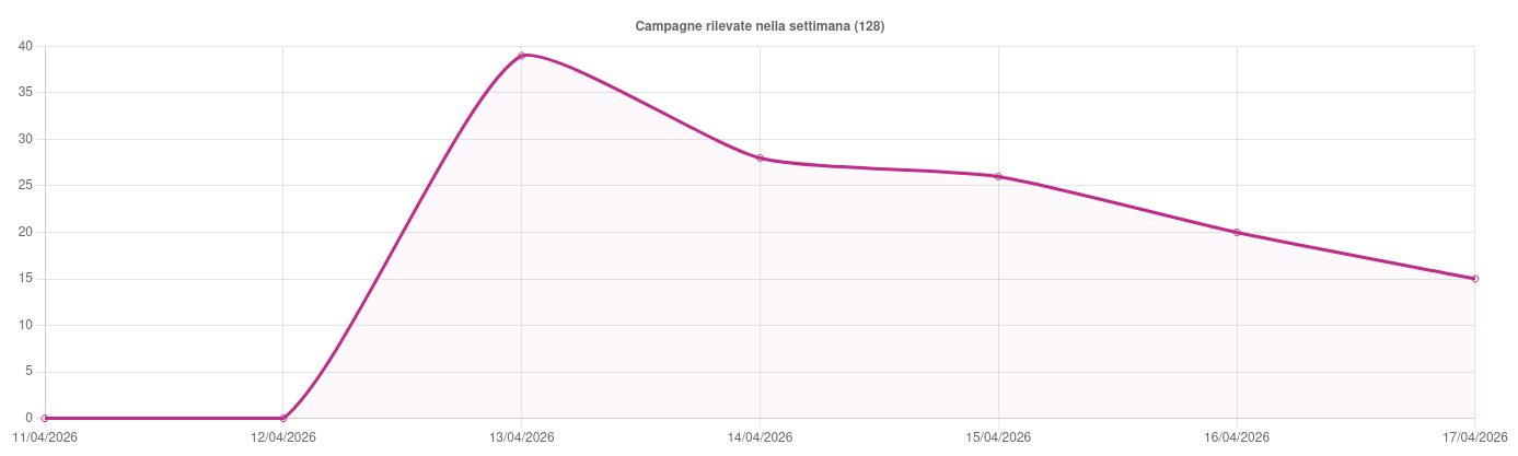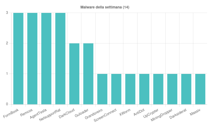 Sono state individuate, nell’arco della settimana, 14 famiglie di malware che hanno interessato l’Italia. Nello specifico, di particolare rilievo, troviamo le seguenti campagne: