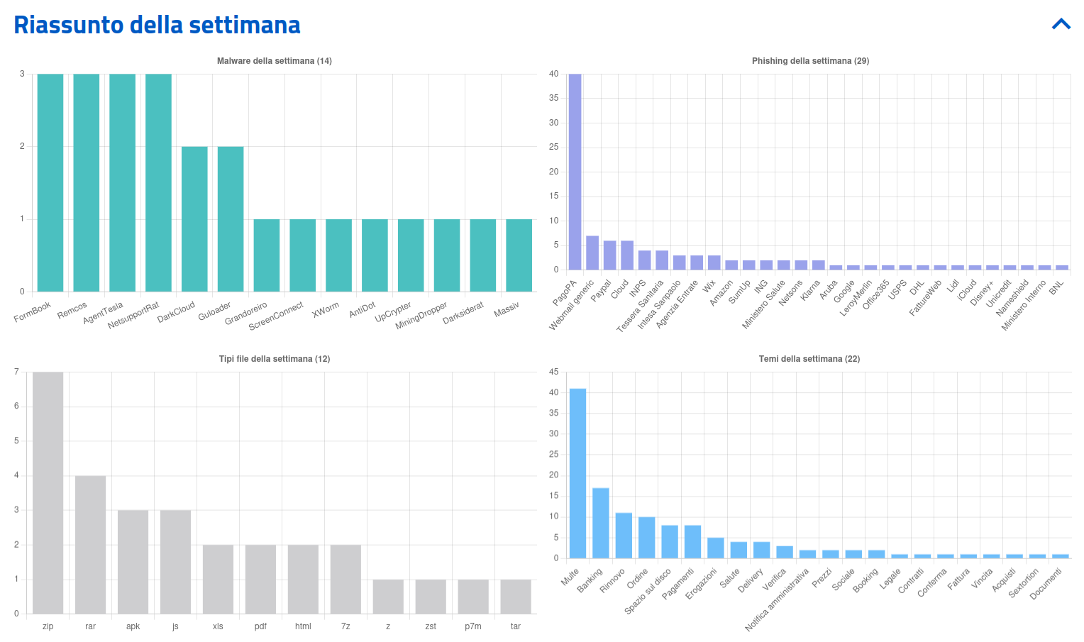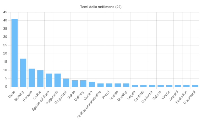 Sono 22 i temi sfruttati questa settimana per veicolare le campagne malevole sul territorio italiano. In particolare si rileva: