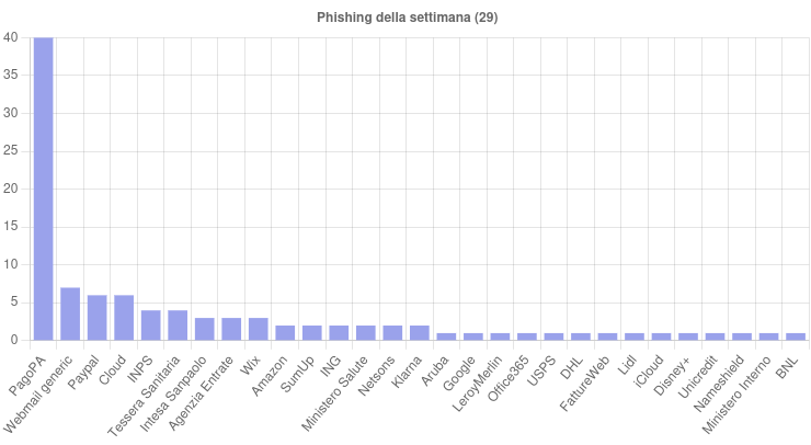 Sono 29 i brand della settimana coinvolti nelle campagne di phishing. Per quantità spiccano le campagne a tema PagoPA, PayPal e INPS.