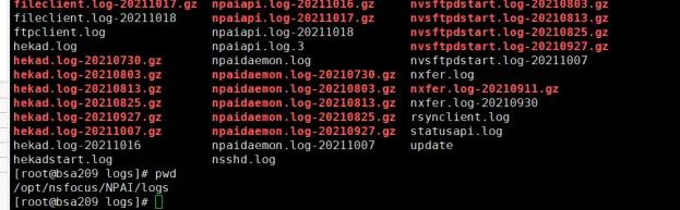 The /opt directory primarily stores information related to the A interface. A common log storage path is /opt/nsfocus/NPAI/logs/. This directory contains log directories specific to the A interface, such as the frequently encountered files hekad.log and nsshd.log. When the A interface encounters an exception, alerts are likely to be generated. Common scenarios include the hekad.log log file consuming excessive disk space, causing the root directory’s disk to become full, and the /opt/nsfocus/NPAI/data/sftp/bsa/tam_protocol directory containing excessively large files, which can also lead to disk abnormalities.