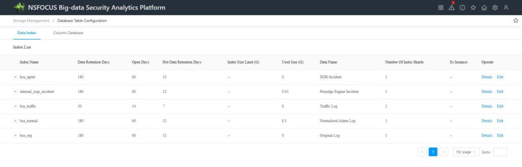 Recommended configuration: It is recommended to configure the incident event index with a longer time retention period, while the bsa_traffic index should have a shorter retention period.