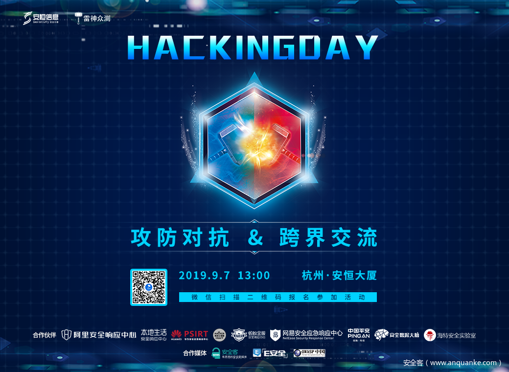 活动简介Hackingday是一次雷神众测的线下聚会,众多顶尖白帽专家相聚杭州,以攻防对抗为核心,跨界交流为主题,就网络安全技术展开探讨。